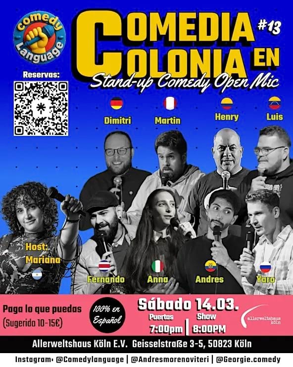 ¡Ven a disfrutar de nuestro Open Mic de Stand-up Comedy en español en la ciudad de Colonia!
