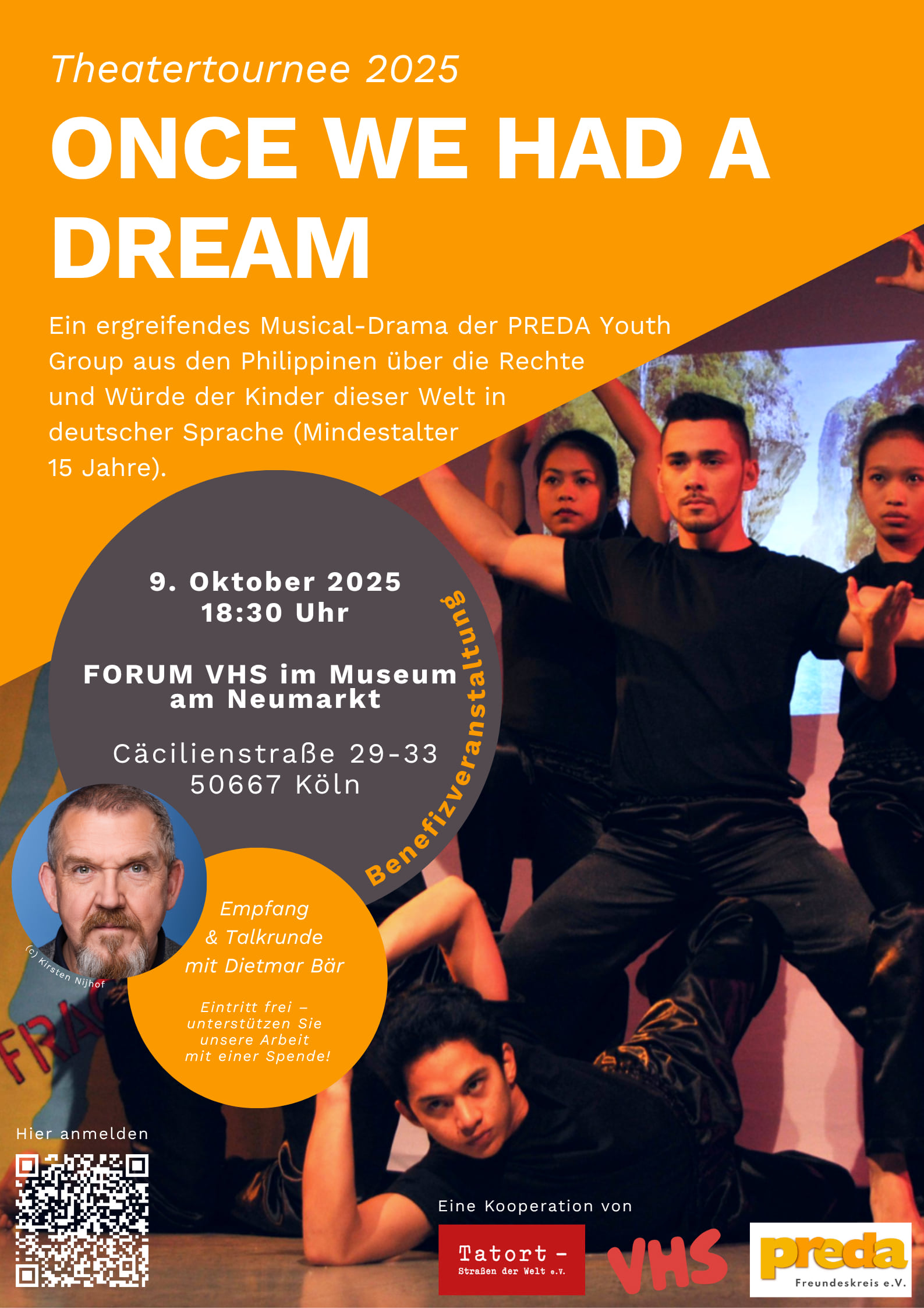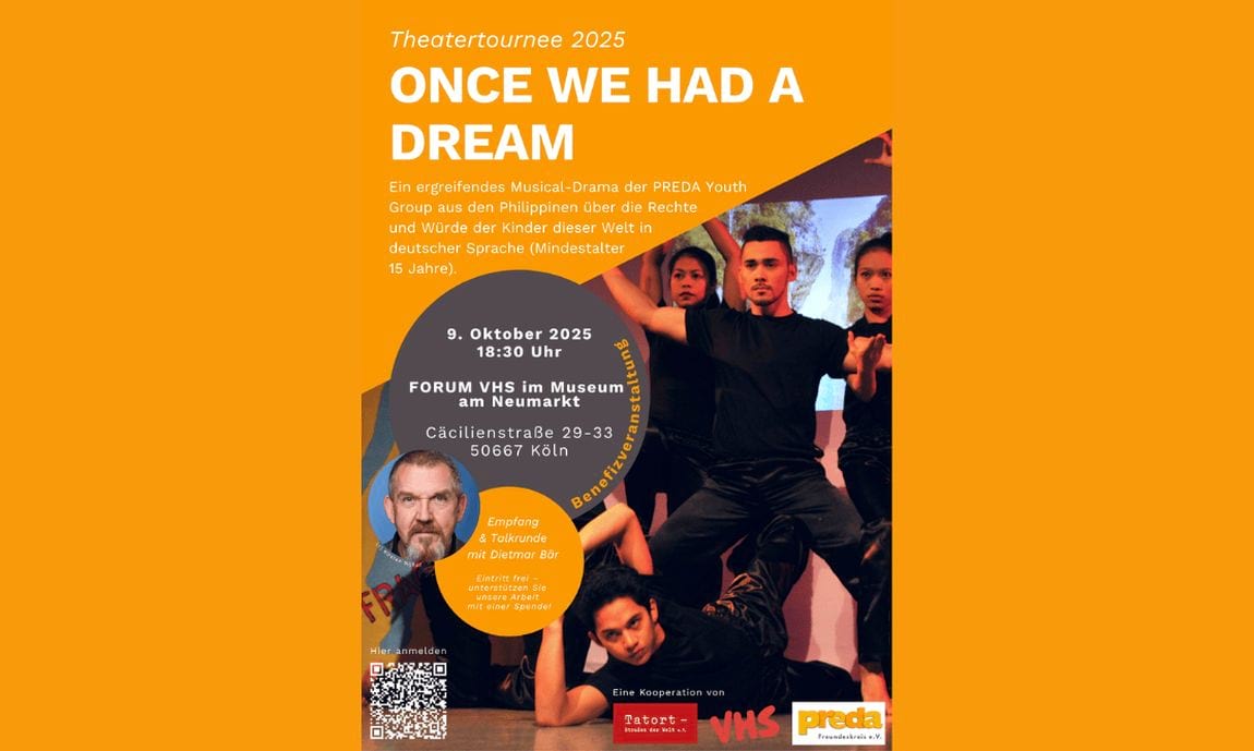 Erleben Sie eine Aufführung, die auf wahren Geschichten von Kindern auf den Philippinen basiert. Dargeboten von unseren philippinischen Gästen. Die Aufführung ist Teil der "PREDA-Theatertournee 2025" und gibt berührende Einblicke in das Leben junger Menschen, die trotz schwerer Erfahrungen Hoffnung und Stärke finden.